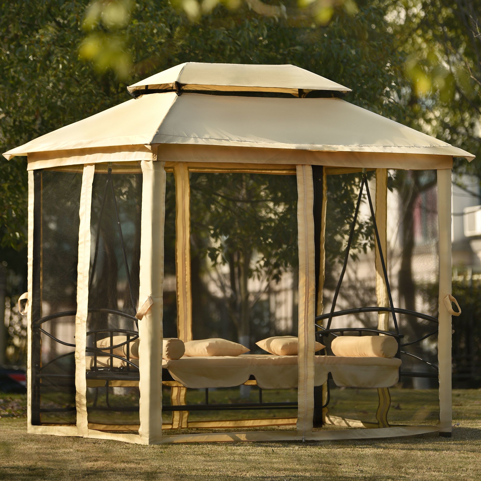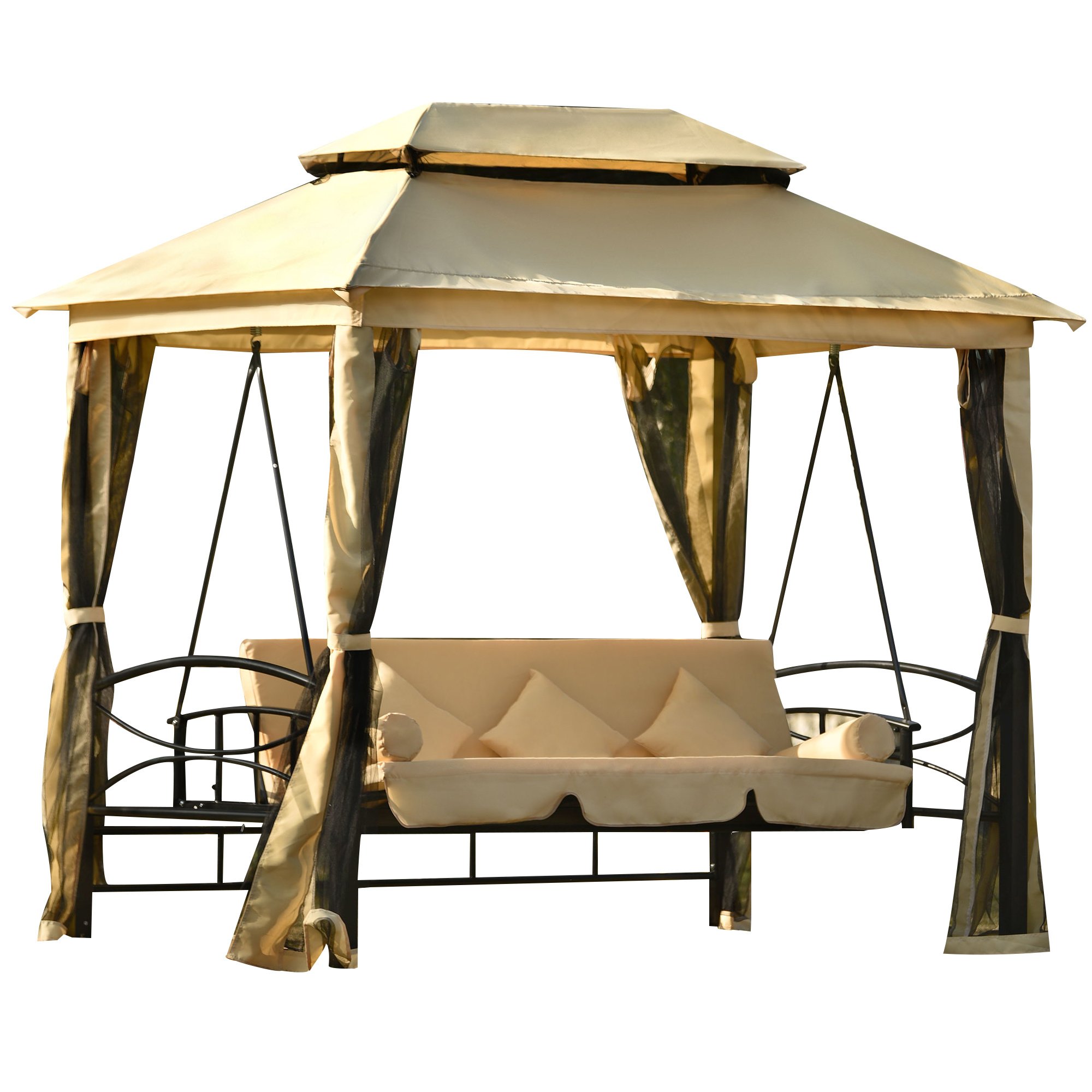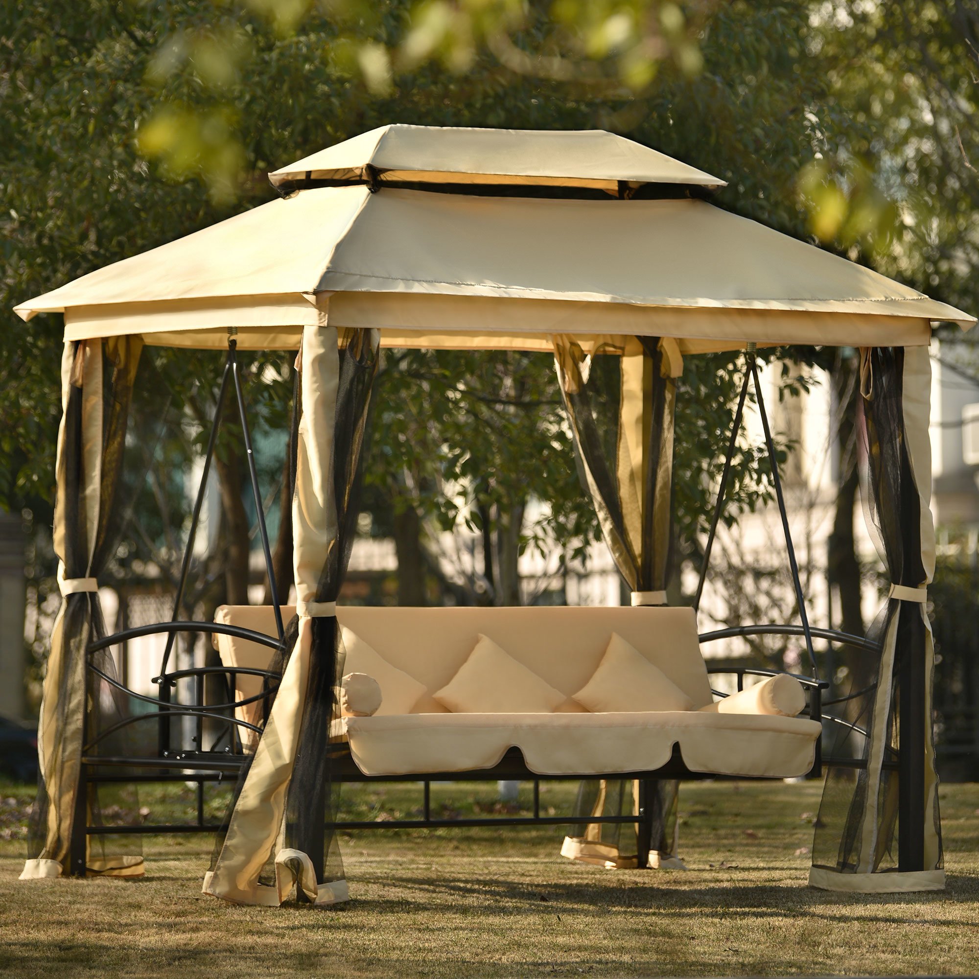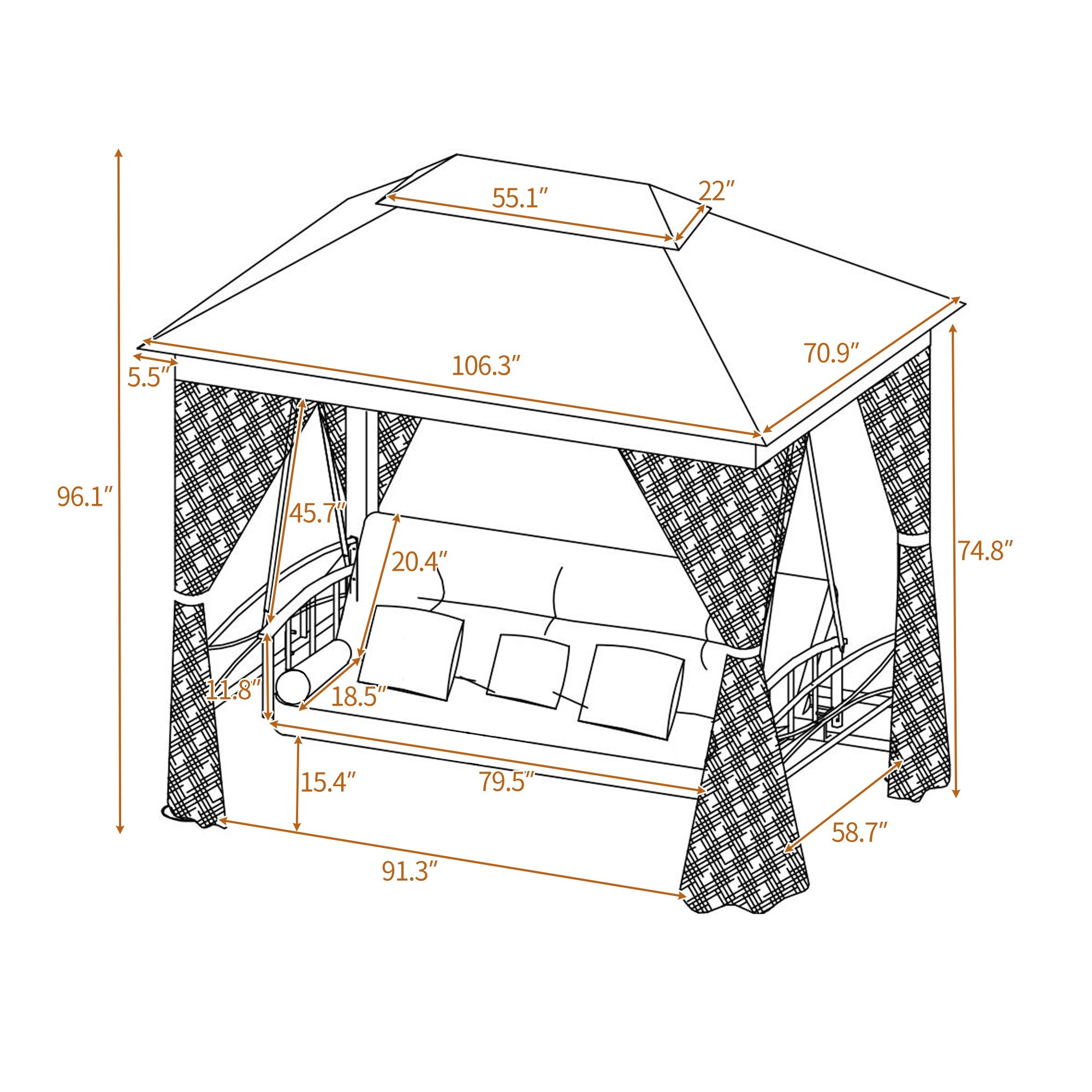 This stylish gazebo swing bench features a spacious and fashionable design; which can comfortably accommodate 3 people to sit and provide shade from the sun with its large canopy. It can be used as an excellent decoration for your garden; courtyard; and poolside for parties; BBQs; or resting. The reinforced 4 legs and 8 ground stakes can offer a firmly support in any weather. The waterproof and breathable PU coated fabric is ideal for use on hot and rainy days. Meanwhile; the 2-tier roof design brings a good air circulation for stability in various conditions.In addition; 4 zipper side walls prevent unwanted pets from entering and add more privacy to you.