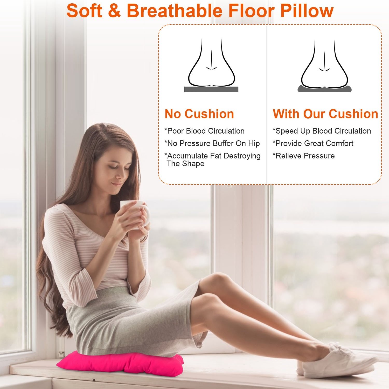 **Ultra-Soft Seat Cushion*:The seat cushion is made of skin-friendly Polyester Fiber fabric and the filling is Pearl cotton; the floor pillow is breathable and comfortable; relaxing your hips and releasing your pressure which is perfect for those who like to sit on the floor to eat; read; meditate; yoga; play games with kids; watching TV or play video games.